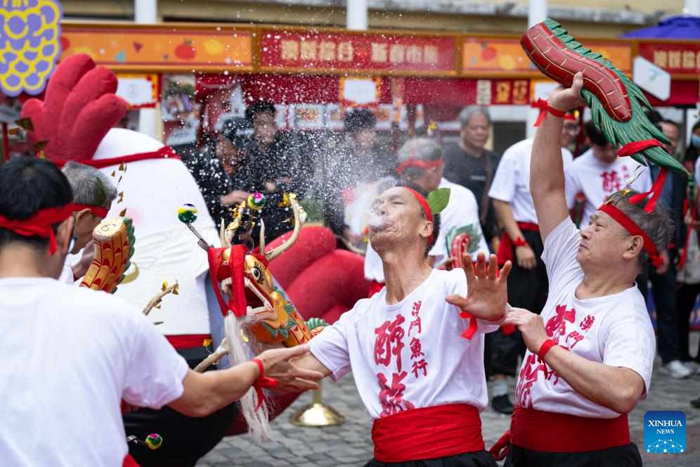 This photo taken on Feb. 17, 2024 shows the drunken dragon dance performance at the revitalized Inner Harbor area in south China's Macao Special Administrative Region (SAR). The Macao SAR government has been committed to revitalizing and utilizing the historic areas in the region. An increasing number of locals and tourists visit these areas today to feel the charm of integration between traditional and modern cultures. (Xinhua/Cheong Kam Ka)
