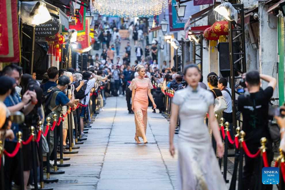 This photo taken on May 3, 2024 shows models presenting creations at an event in the pedestrian area of revitalized Fulong New Street in south China's Macao Special Administrative Region (SAR). The Macao SAR government has been committed to revitalizing and utilizing the historic areas in the region. An increasing number of locals and tourists visit these areas today to feel the charm of integration between traditional and modern cultures. (Xinhua/Cheong Kam Ka)