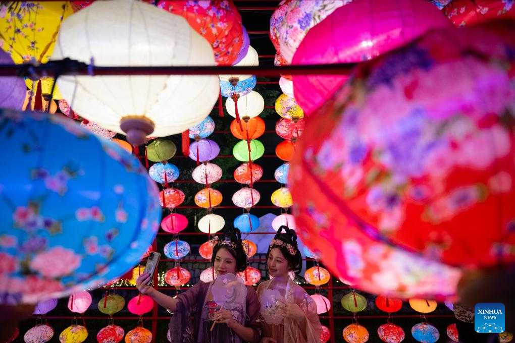 People in traditional Chinese costumes take selfies at the revitalized Mount Fortress in south China's Macao Special Administrative Region (SAR), Sept. 17, 2024. The Macao SAR government has been committed to revitalizing and utilizing the historic areas in the region. An increasing number of locals and tourists visit these areas today to feel the charm of integration between traditional and modern cultures. (Xinhua/Cheong Kam Ka)