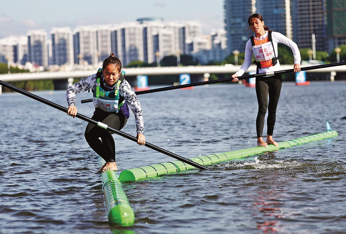 Athletes compete in the single bamboo drifting final at the games. (Wei Xiaohao/China Daily)