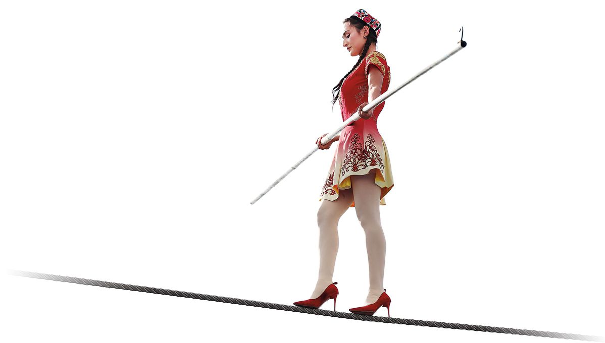 A woman from Xinjiang team demonstrates Dawaz — acrobatic Uygur tightrope walking, on Nov 27, during the 12th National Traditional Games of Ethnic Minorities of China. (Wei Xiaohao/China Daily)