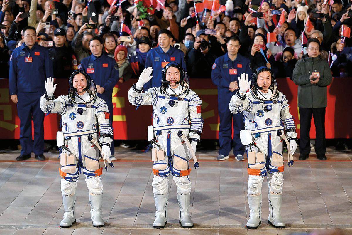(From right) Shenzhou XIX crew members Cai Xuzhe, Song Lingdong and Wang Haoze salute the crowd at the Jiuquan Satellite Launch Center on Oct 30 before the mission. (Photo/Xinhua)