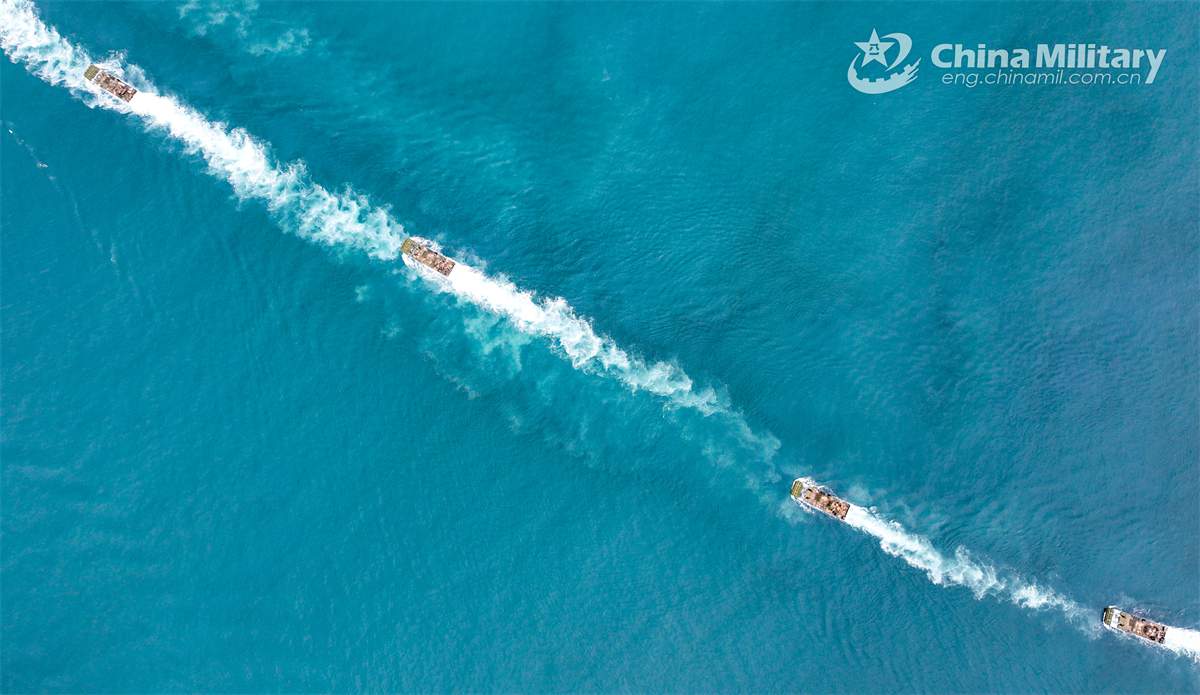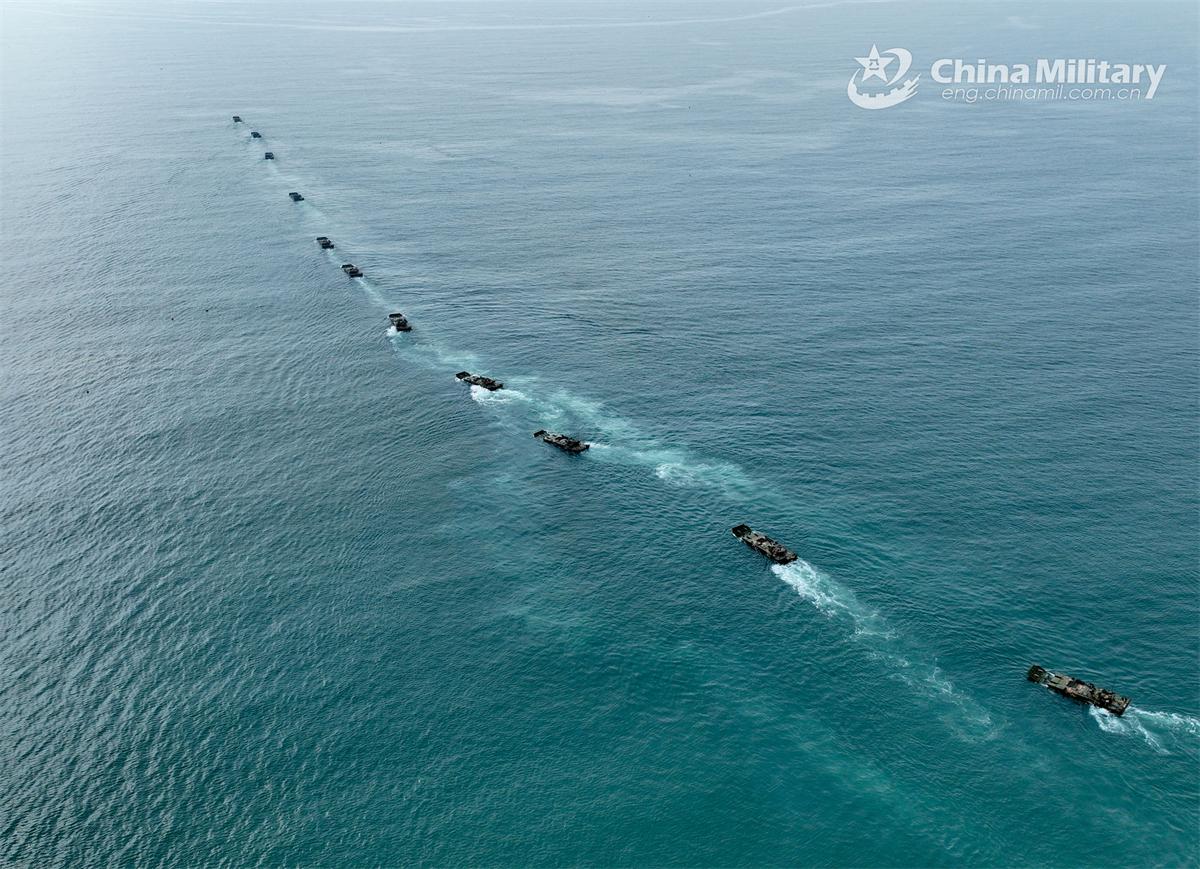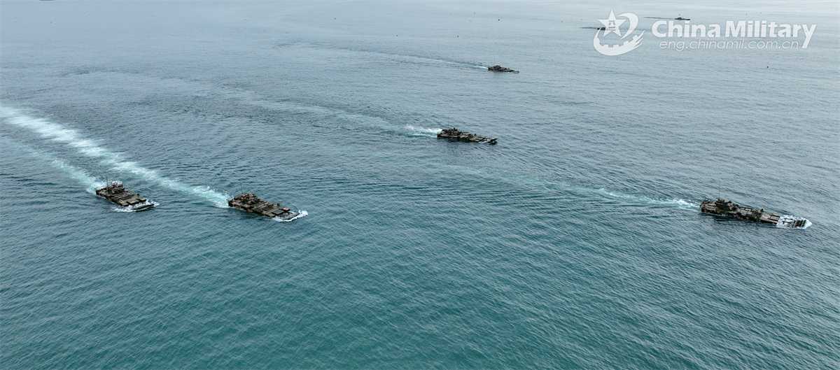 Amphibious armored infantry fighting vehicles (IFV) attached to a brigade with the Chinese PLA Army maneuver towards the designated area during a ferry and assault wave formation training exercise on November 3, 2024. (eng.chinamil.com.cn/Photo by Wu Zhishuo)