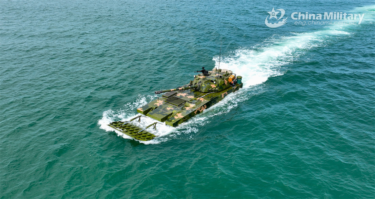 An amphibious armored infantry fighting vehicle attached to a brigade with the Chinese PLA Army engages in a ferry and assault wave formation training exercise on November 3, 2024. (eng.chinamil.com.cn/Photo by Wu Zhishuo)