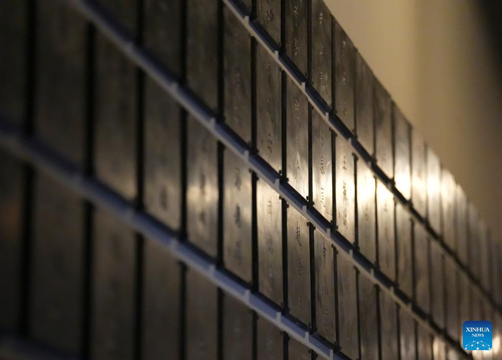 This photo taken on Dec. 12, 2024 shows the wall with victims' names at the former site of Unit 731 in Harbin, northeast China's Heilongjiang Province. The former site of the notorious Japanese germ warfare army, known as Unit 731, reopened to public on Friday with a special exhibition on cultural relics and historical materials of Japan's germ-warfare crimes in China.