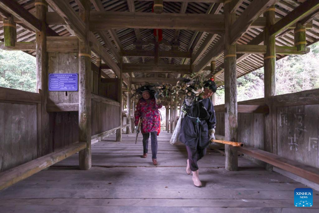 Local villagers walk on the Santiao Bridge in Taishun County of Wenzhou City, east China's Zhejiang Province, Dec. 12, 2024. In Taishun County, roofed arch bridges have long served as important pathways facilitating transportation and benefiting locals in areas abound in rivers and mountains. Currently, Taishun is home to over 30 ancient roofed arch bridges including traditional wooden arch bridges. On Dec. 5, UNESCO added traditional design and practices for building Chinese wooden arch bridges to its Representative List of Intangible Cultural Heritage of Humanity. (Xinhua/Jiang Han)