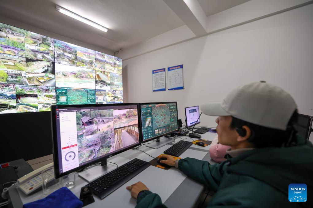 A staff member of cultural relics preservation monitors the condition of ancient roofed arch bridges in Taishun County of Wenzhou City, east China's Zhejiang Province, Dec. 12, 2024. In Taishun County, roofed arch bridges have long served as important pathways facilitating transportation and benefiting locals in areas abound in rivers and mountains. Currently, Taishun is home to over 30 ancient roofed arch bridges including traditional wooden arch bridges. On Dec. 5, UNESCO added traditional design and practices for building Chinese wooden arch bridges to its Representative List of Intangible Cultural Heritage of Humanity. (Xinhua/Jiang Han)