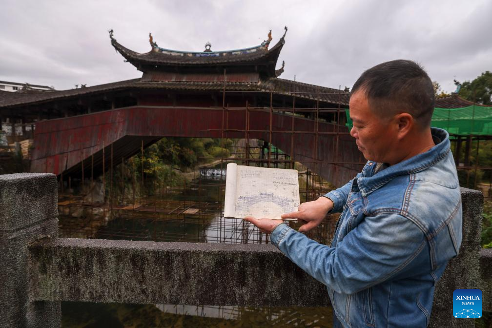 Zeng Jiakuai, a provincial-level inheritor of traditional design and practices for building Chinese wooden arch bridges, displays his hand-drawing of the structure of Xidong Bridge in front of the bridge in Taishun County of Wenzhou City, east China's Zhejiang Province, Dec. 11, 2024. In Taishun County, roofed arch bridges have long served as important pathways facilitating transportation and benefiting locals in areas abound in rivers and mountains. Currently, Taishun is home to over 30 ancient roofed arch bridges including traditional wooden arch bridges. On Dec. 5, UNESCO added traditional design and practices for building Chinese wooden arch bridges to its Representative List of Intangible Cultural Heritage of Humanity. (Xinhua/Jiang Han)