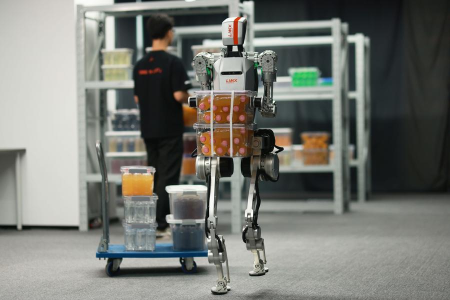 This undated file photo shows a CL-1 humanoid robot performing heavy-load delivery tasks at a sci-tech company in Shenzhen, south China's Guangdong Province. (Xinhua)