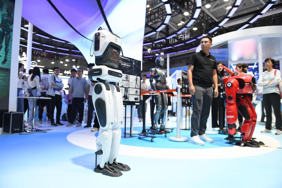 A tech firm demonstrates the walking capability of an SA01 bipedal robot during the 26th China High-Tech Fair (CHTF) in Shenzhen, south China's Guangdong Province, Nov. 14, 2024. (Xinhua/Mao Siqian)