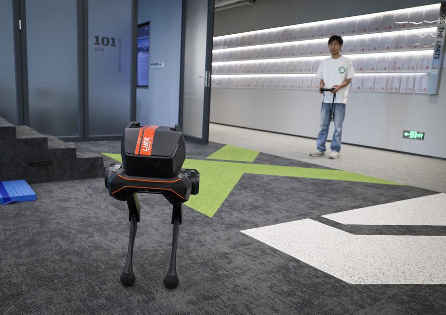 A staff member demonstrates the walking ability of a TRON1 bipedal robot at a sci-tech company in Shenzhen, south China's Guangdong Province, Dec. 6, 2024. (Xinhua/Mao Siqian)