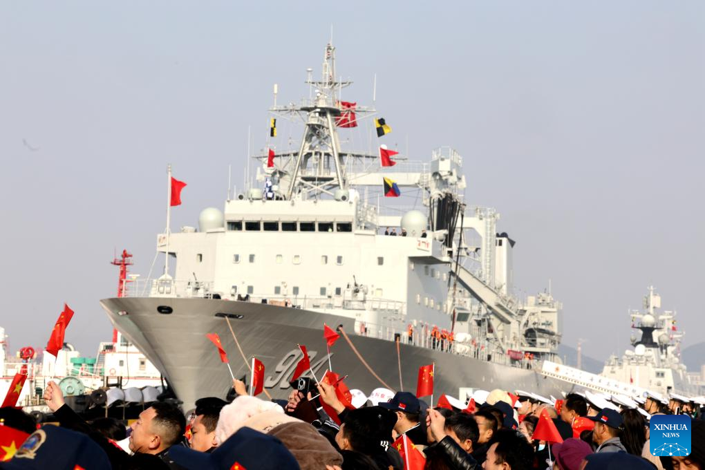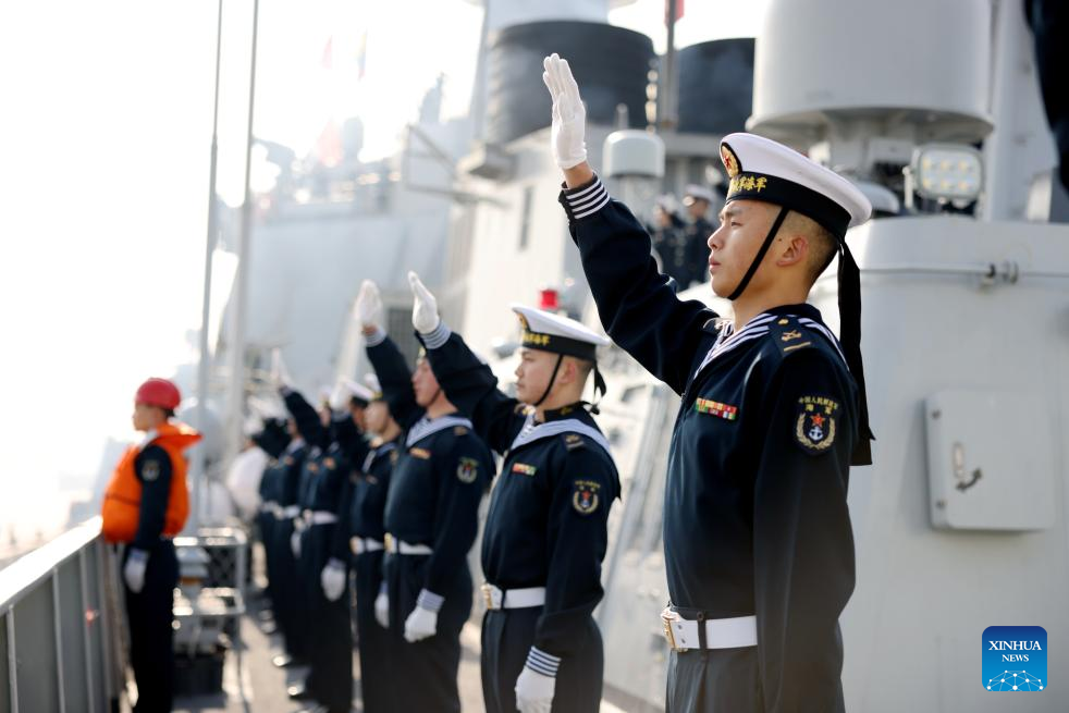 A farewell ceremony is held for a Chinese navy fleet at a port in Zhoushan, east China's Zhejiang Province, Dec. 15, 2024. A new fleet of the Chinese People's Liberation Army Navy set sail from a military port in Zhoushan, east China's Zhejiang Province on Sunday to take over an escort mission from the previous fleet in the Gulf of Aden and the waters off Somalia. (Photo by Yang Haifan/Xinhua)