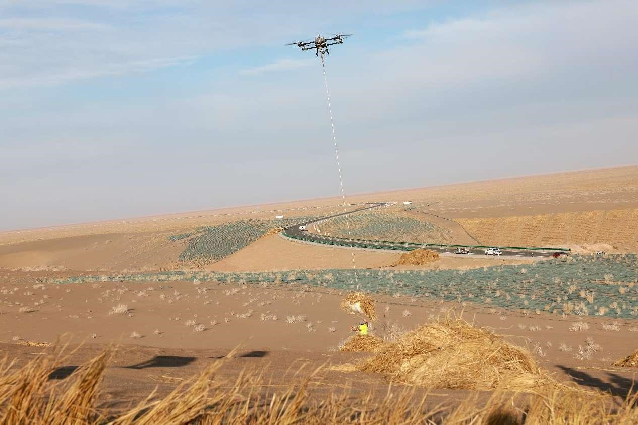 A drone delivers straw to the center of desert in Jiuquan, northwest China's Gansu province, Dec. 3, 2024. (People's Daily Online/Cao Hongzu)