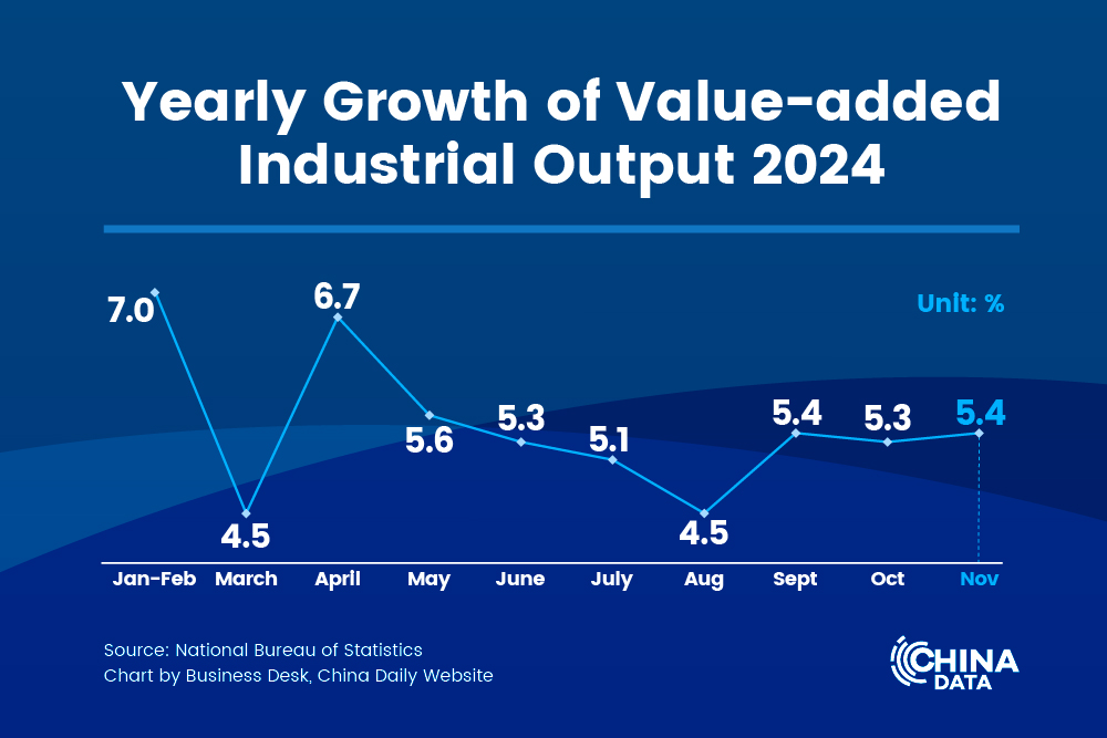 Output of industries above a designated level grew by 5.4 percent year-on-year in November, a 0.1 percentage point higher than last month. The output of high-tech manufacturing sector increased 7.8 percent year-on-year, 2.4 percentage points higher than the output growth of all industries.