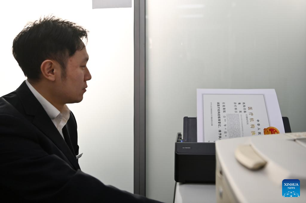 A staff member prints out a license for medical services for the Perennial General Hospital Tianjin at the government affairs service center in north China's Tianjin Municipality, Dec. 16, 2024. (Xinhua/Li Ran)