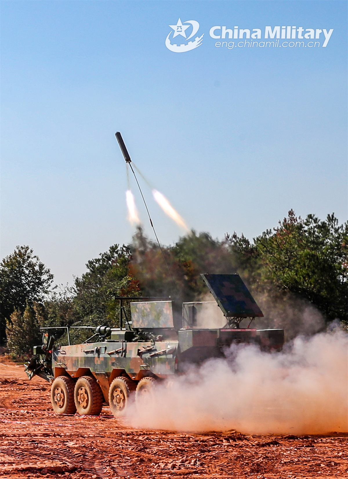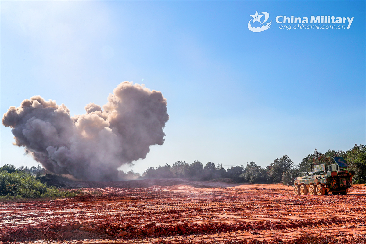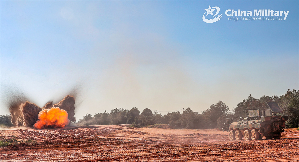 An integrated minesweeping vehicle attached to an engineer element of a brigade under the Chinese PLA 72nd Group Army fires a wire-guided minesweeping explosive device towards the obstacle area during a minesweeping operation on November 26, 2024. (eng.chinamil.com.cn/Photo by Zhang Mao)
