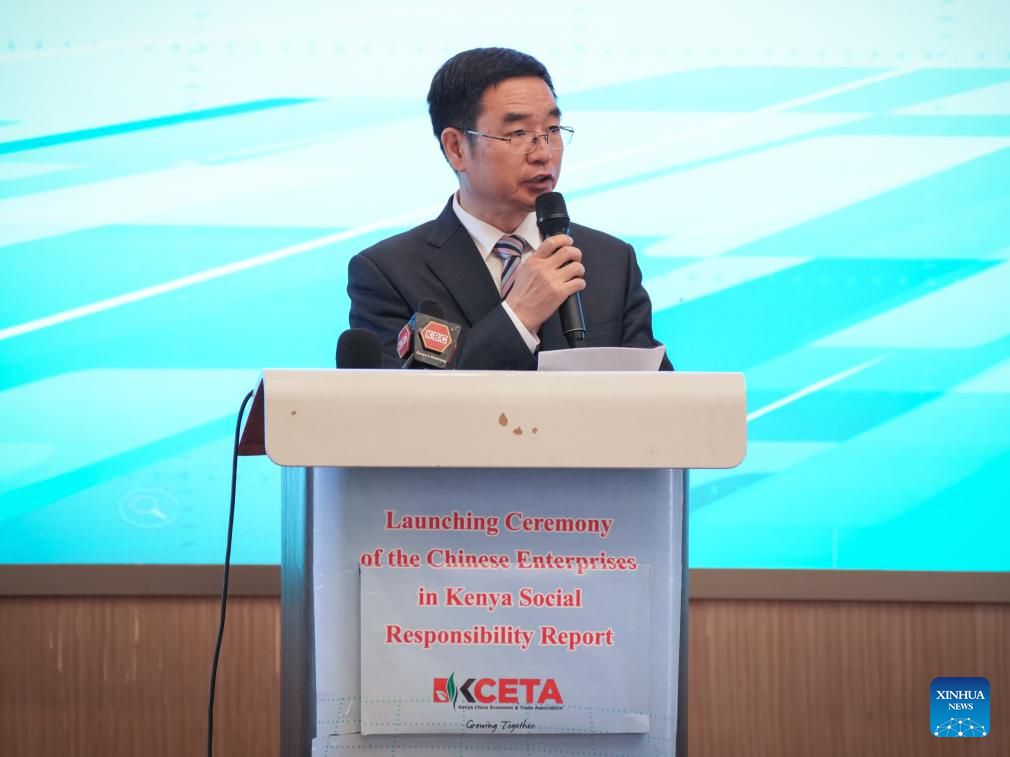 Zhou Zhencheng, minister counselor at the Chinese Embassy in Kenya, speaks during a launching ceremony of the Chinese Enterprises in Kenya Social Responsibility Report in Nairobi, Kenya, on Dec. 17, 2024. Kenya's quest for green development, modernization and skills upgrade has borne fruits, driven by the proactive involvement of Chinese firms operating in the country, according to a report launched Tuesday in Nairobi. In its fourth edition, the Corporate Social Responsibility (CSR) report compiled by the Kenya China Economic and Trade Association (KCETA) covering 2022-2023, said that these companies have rallied behind Kenya's long-term growth and transformation agenda. (Xinhua/Li Yahui)