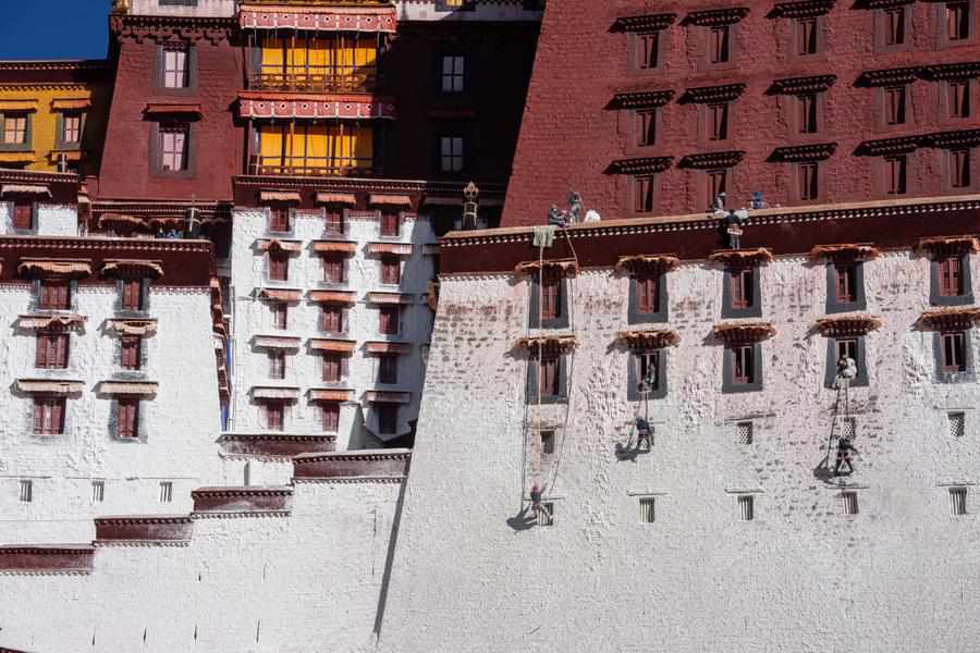 Workers paint the wall of the Potala Palace during an annual renovation of the ancient architectural complex in Lhasa, southwest China's Xizang Autonomous Region, Oct. 30, 2024. (Xinhua/Tenzing Nima Qadhup)