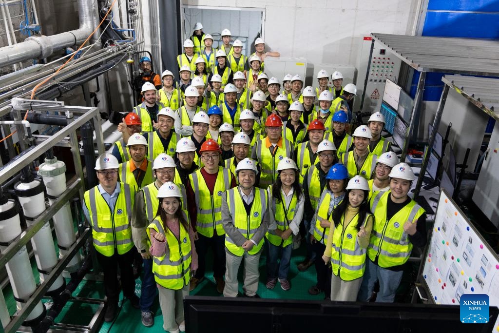 Researchers pose for a group photo to mark the start of liquid filling at the Jiangmen Underground Neutrino Observatory (JUNO) in Jiangmen, south China's Guangdong Province, Dec. 18, 2024. The liquid filling of the central detector of JUNO started on Wednesday. As one of the world's most powerful experiments to uncover neutrino mystery, JUNO is expected to operate for at least 30 years. (Xinhua/Jin Liwang)