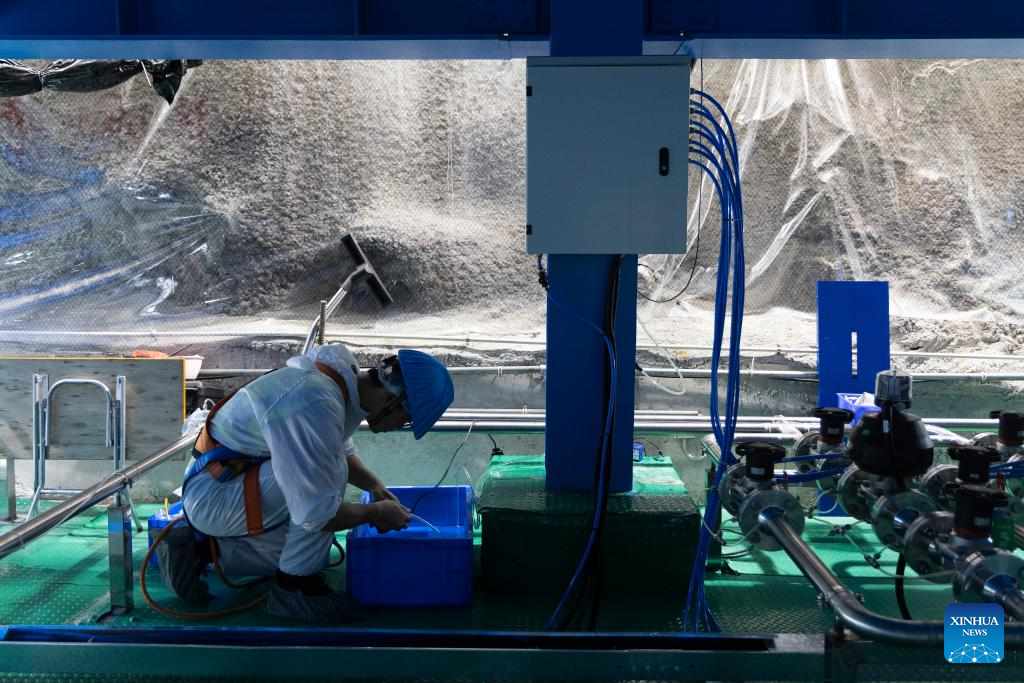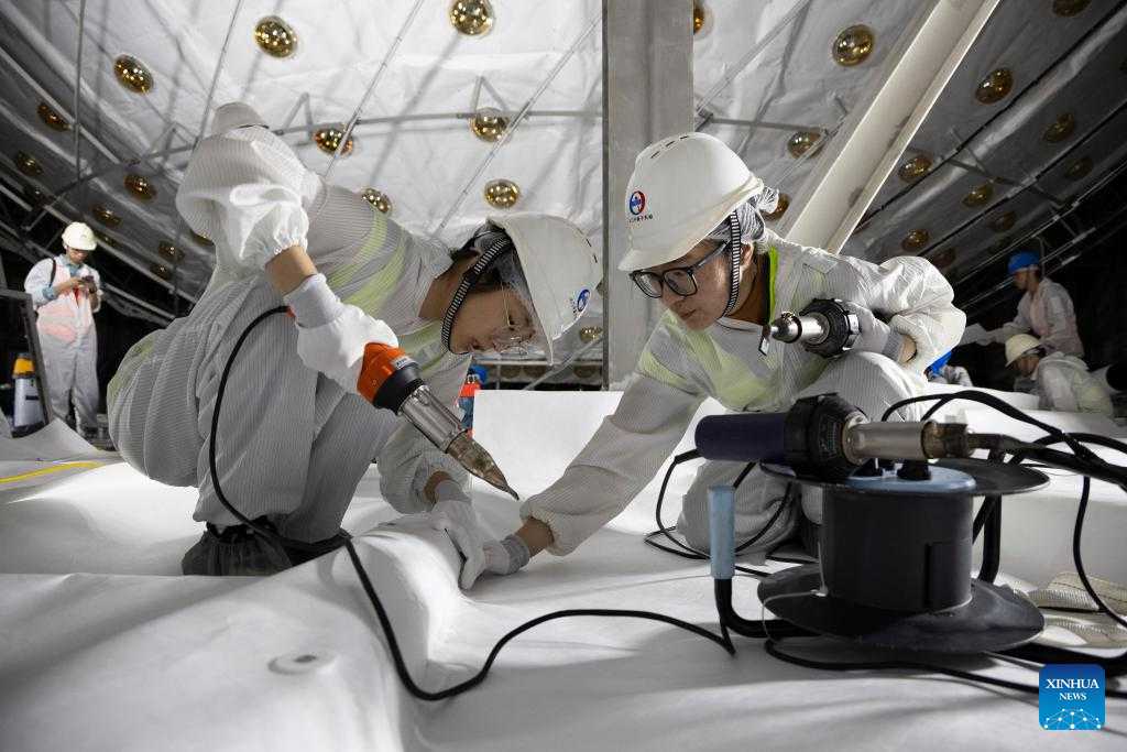 Staff members seal the bottom of a water tank with Tyvek material at the construction site of the Jiangmen Underground Neutrino Observatory (JUNO) in Jiangmen, south China's Guangdong Province, Dec. 16, 2024. The liquid filling of the central detector of JUNO started on Wednesday. As one of the world's most powerful experiments to uncover neutrino mystery, JUNO is expected to operate for at least 30 years. (Xinhua/Jin Liwang)