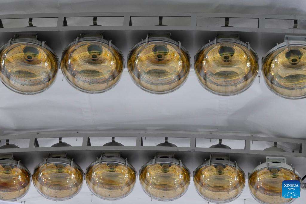This photo taken on Dec. 17, 2024 shows photo-multiplier tubes inside the acrylic sphere of the Jiangmen Underground Neutrino Observatory (JUNO) in Jiangmen, south China's Guangdong Province. The liquid filling of the central detector of JUNO started on Wednesday. As one of the world's most powerful experiments to uncover neutrino mystery, JUNO is expected to operate for at least 30 years. (Xinhua/Jin Liwang)