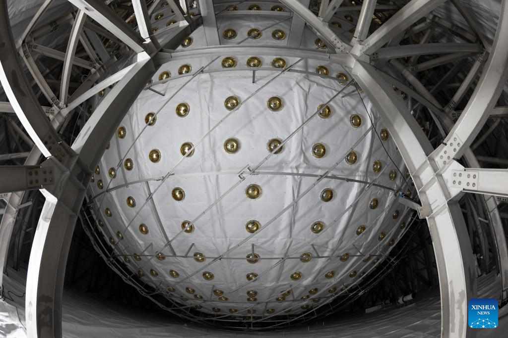 This photo taken on Dec. 16, 2024 shows the central detector of the Jiangmen Underground Neutrino Observatory (JUNO) in Jiangmen, south China's Guangdong Province. The liquid filling of the central detector of JUNO started on Wednesday. As one of the world's most powerful experiments to uncover neutrino mystery, JUNO is expected to operate for at least 30 years. (Xinhua/Jin Liwang)