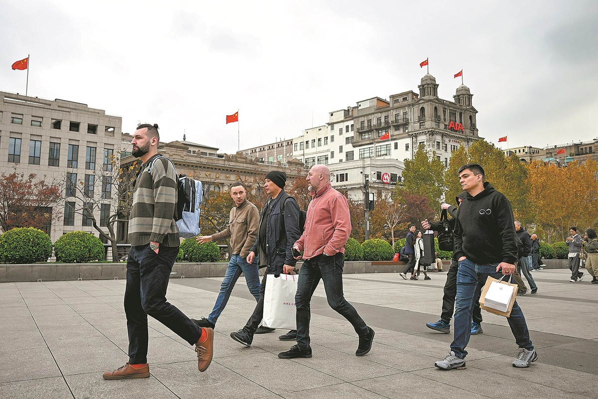 Tourists from Russia visit the Bund in Shanghai on Dec 4. (Chen Haoming/Xinhua)