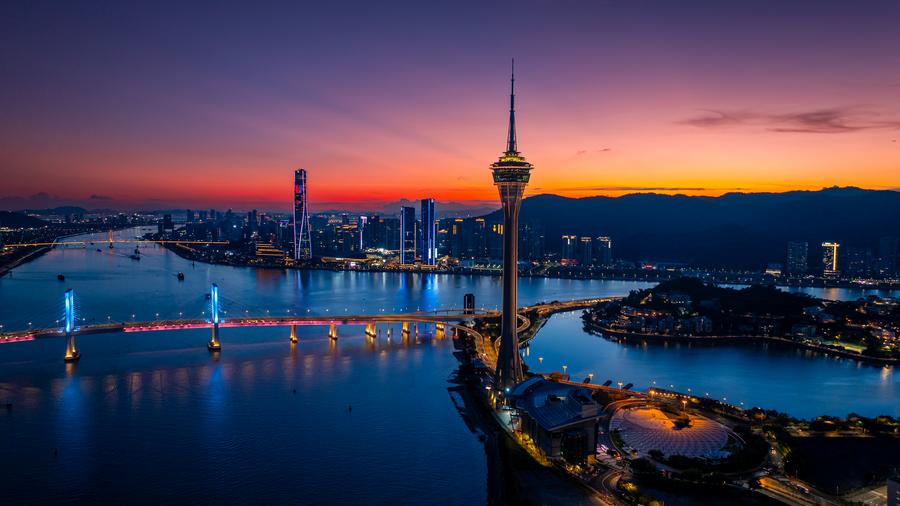 An aerial drone photo taken on July 5, 2024 shows a night view of the Macao Tower (front) in Macao and Zhuhai of Guangdong in south China. (Xinhua/Cheong Kam Ka)