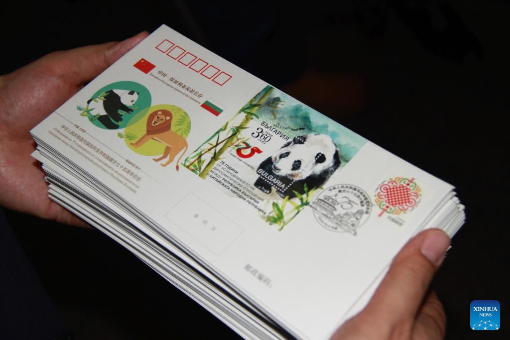 A commemorative envelope with a postage stamp in celebration of the 75th anniversary of the establishment of diplomatic relations between Bulgaria and China is seen at the launch ceremony in Sofia, Bulgaria, on Dec. 18, 2024. A special postage stamp marking the 75th anniversary of the establishment of diplomatic relations between Bulgaria and China was released at the ceremony here on Wednesday. (Photo by Marian Draganov/Xinhua)
