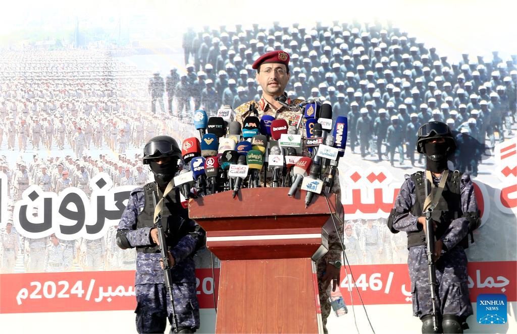 Houthi military spokesperson Yahya Sarea speaks at a rally of the Houthi supporters in Sanaa, Yemen, on Dec. 20, 2024. Yemen's Houthi group said they launched joint drone attacks with the Iraqi Resistance on Friday against "military and vital targets" in Israel. (Photo by Mohammed Mohammed/Xinhua)