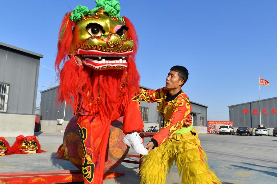 SHIJIAZHUANG, Dec. 22 (Xinhua) -- Cangxian Lion Dance is a unique folk art with a long history, which was inscribed into the national intangible cultural heritage list in 2008. Thanks to the policy and funding support of local authorities in recent years, the traditional art has been well passed on. There are nine registered lion dance teams and nearly 1,000 performers in the county.