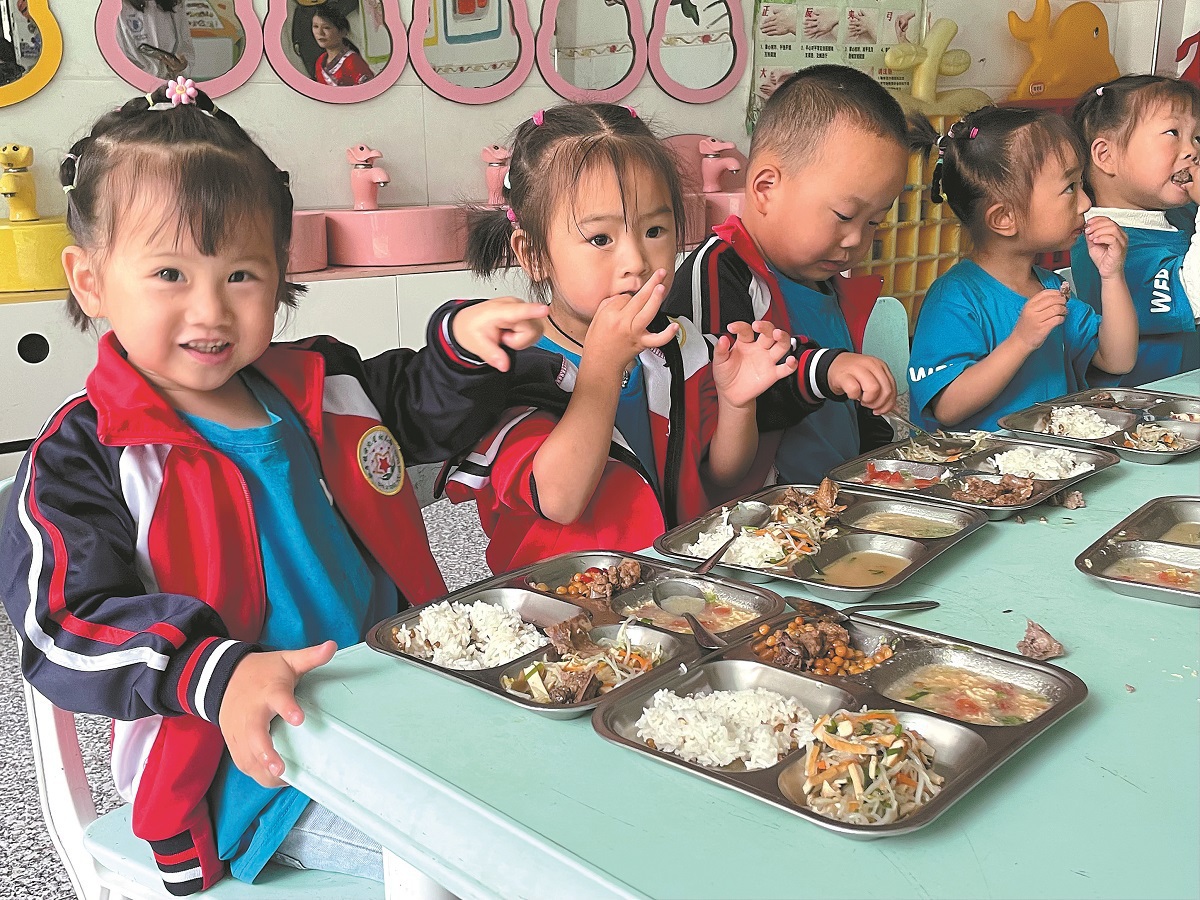 Children have their free nutritious lunch at a village kindergarten in Longshan town, Xiangxi, Hunan province, on June 27. (Yao Yuxin/China Daily)