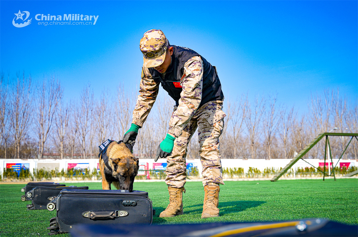 A military dog assigned to the Chinese People's Armed Police Force (PAP) Tianjin Corps follows instruction to inspect suspicious luggage during a multi-subject training exercise on December 9, 2024. (eng.chinamil.com.cn/Photo by Gong Xu)