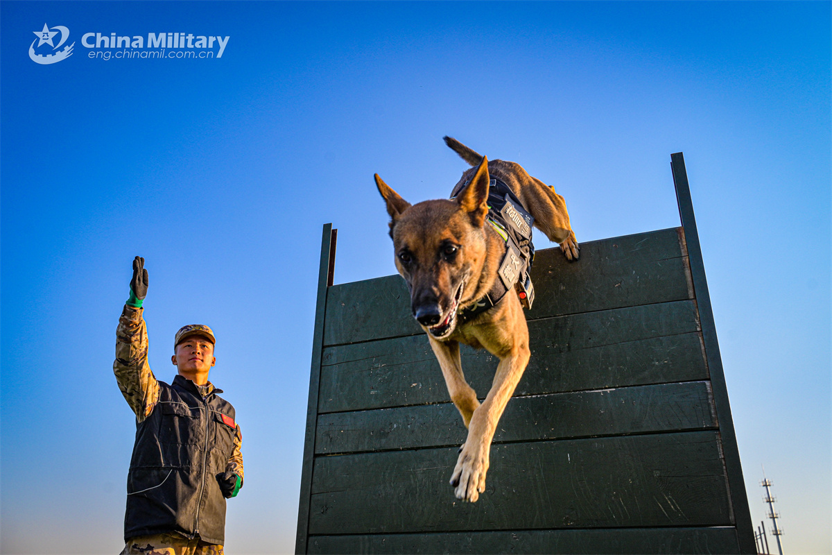 A military dog assigned to the Chinese People's Armed Police Force (PAP) Tianjin Corps jumps up an obstacle during a multi-subject training exercise on December 9, 2024. (eng.chinamil.com.cn/Photo by Gong Xu)