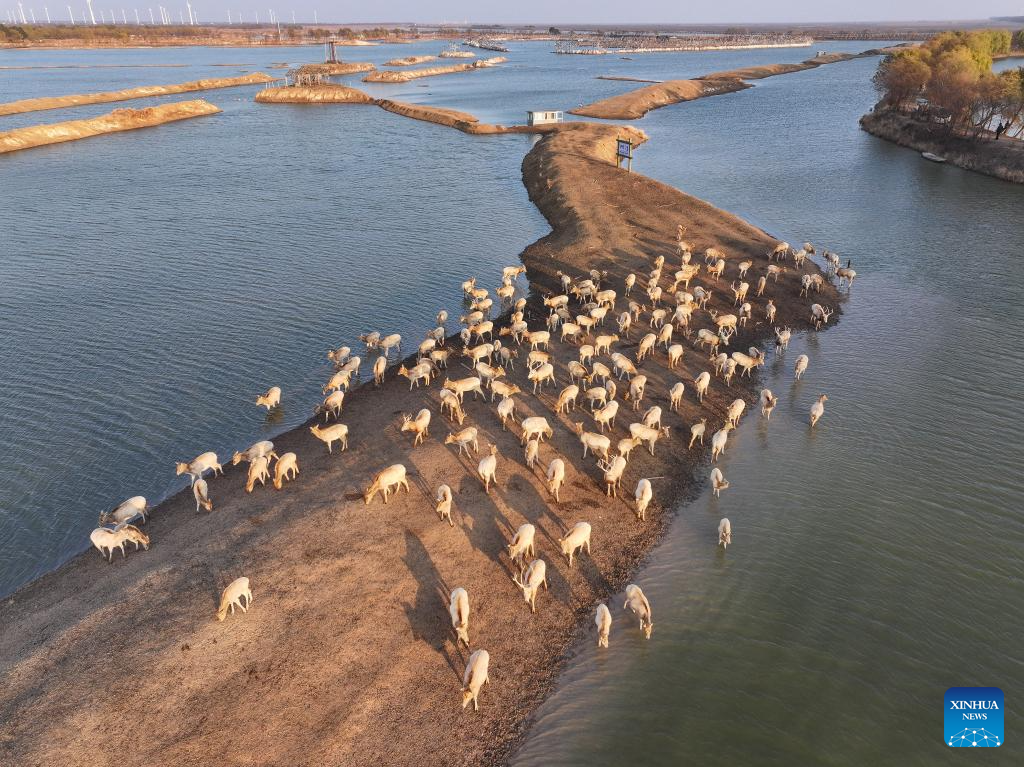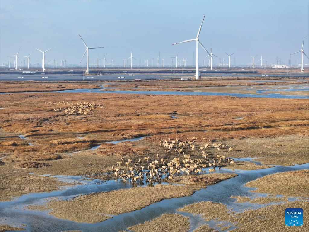 An aerial drone photo taken on Dec. 21, 2024 shows elks in Dafeng District of Yancheng City, east China's Jiangsu Province. The population of elks here has maintained a stable growth over years as the ecological environment in Dafeng District continues to improve. (Xinhua/Ji Chunpeng)