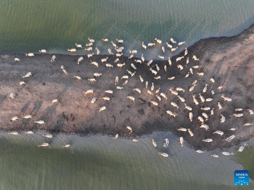 An aerial drone photo taken on Dec. 21, 2024 shows elks on the Yellow Sea mudflats in Dafeng District of Yancheng City, east China's Jiangsu Province. The population of elks here has maintained a stable growth over years as the ecological environment in Dafeng District continues to improve. (Xinhua/Ji Chunpeng)