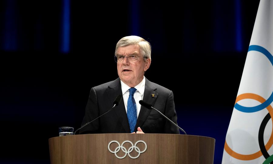 Thomas Bach, president of the International Olympic Committee (IOC), speaks during the 142nd IOC session on Aug. 10, 2024. (Xinhua/Wu Huiwo)