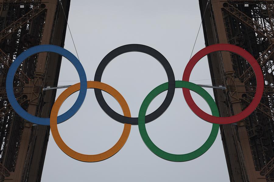 The Olympic rings are seen on the Eiffel Tower ahead of the opening ceremony of the Paris 2024 Olympic Games on July 26, 2024. (Xinhua/Gao Jing)