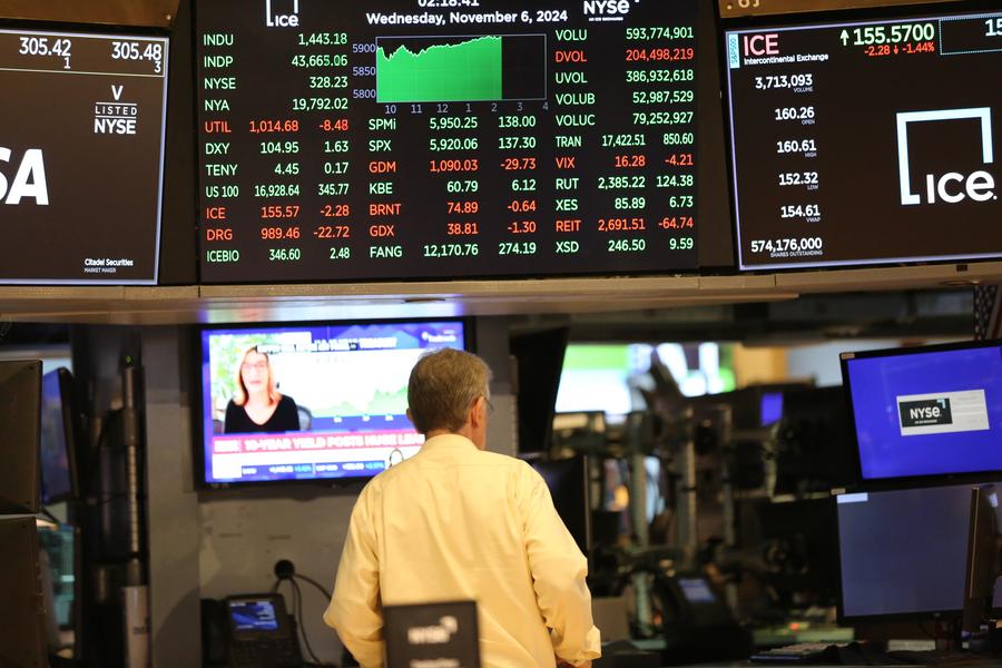 A trader walks past trading posts on the trading floor of the New York Stock Exchange in New York, the United States, on Nov. 6, 2024. (Xinhua/Liu Yanan)