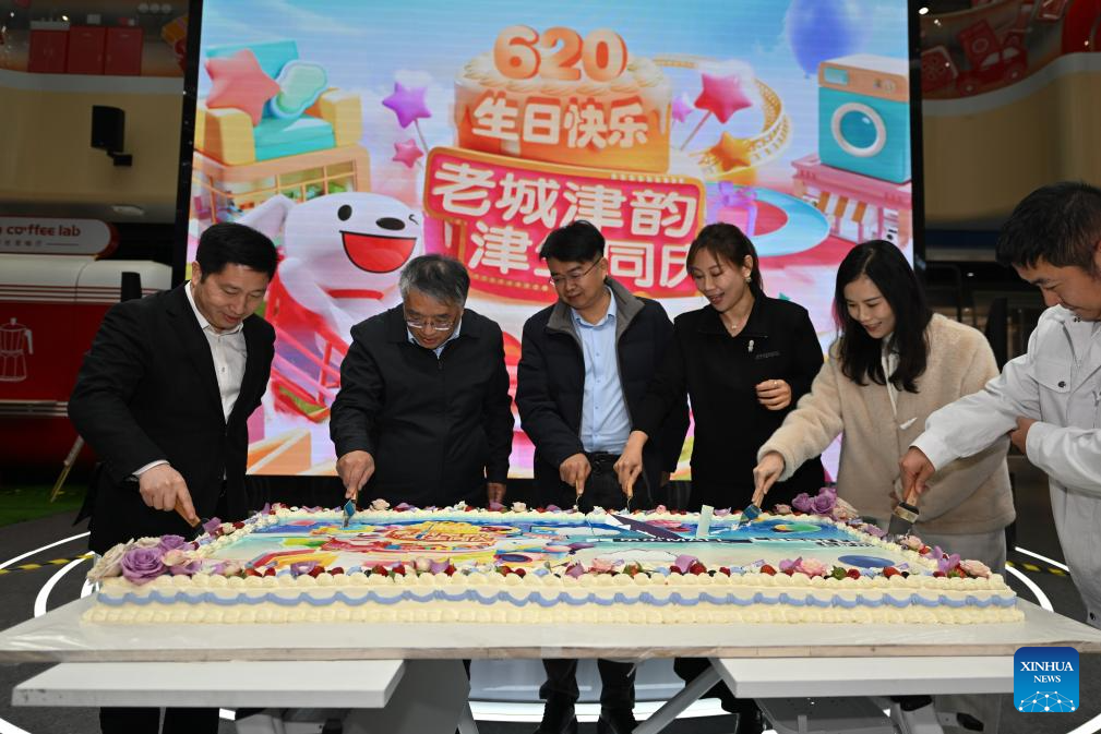 People attend a cake-cutting ceremony to celebrate the "birthday" of Tianjin City at a shopping mall in Tianjin, north China, Dec. 22, 2024. Dec. 23 this year marks the 620th anniversary of establishment of the Tianjin City, which now stands as a tremendous attraction for tourists from home and abroad. (Xinhua/Sun Fanyue)