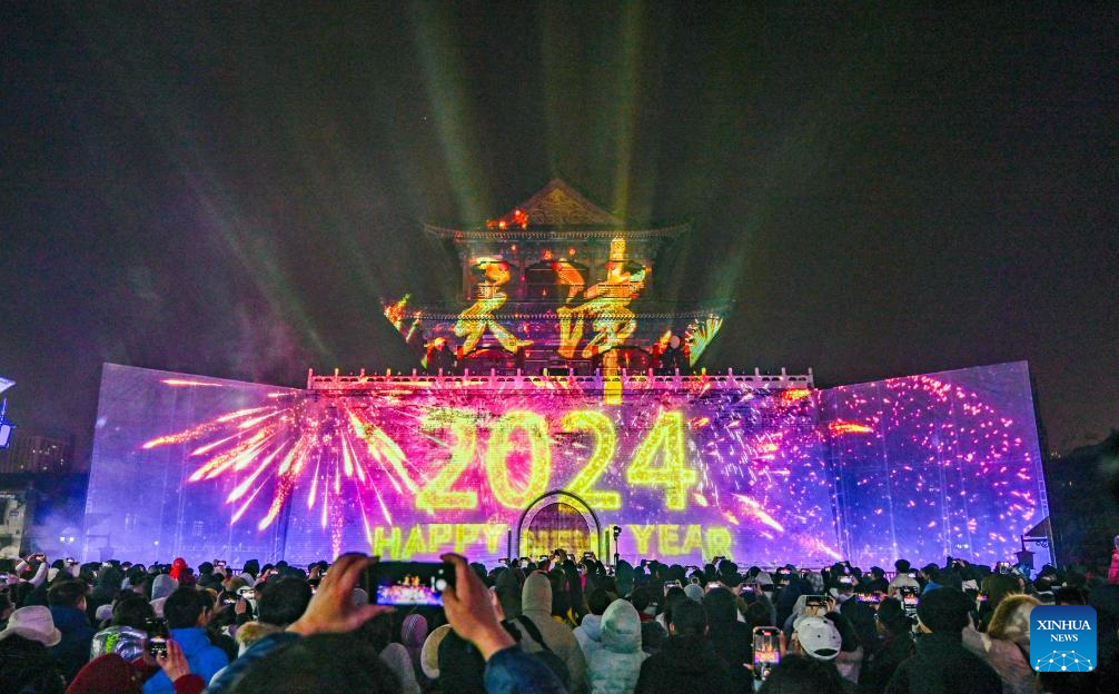 People watch a New Year light show in front of the Drum Tower in Tianjin, north China, Jan. 1, 2024. Dec. 23 this year marks the 620th anniversary of establishment of the Tianjin City, which now stands as a tremendous attraction for tourists from home and abroad. (Xinhua/Sun Fanyue)