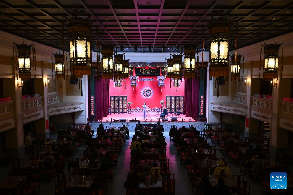 People watch a performance at a theater of Deyunshe, the crosstalk troupe led by Guo Degang, in Tianjin, north China, Dec. 21, 2024. Dec. 23 this year marks the 620th anniversary of establishment of the Tianjin City, which now stands as a tremendous attraction for tourists from home and abroad. (Xinhua/Sun Fanyue)