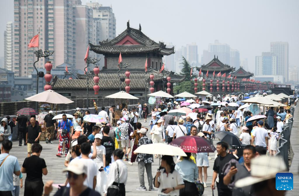 Tourists visit the ancient city wall in Xi'an, northwest China's Shaanxi Province, Aug. 8, 2024. Xi'an, also known as Chang'an in ancient times, has a history stretching back over 3,100 years. Boasting world-famous sites such as the Terracotta Warriors, Xi'an served as the capital for 13 dynasties over the course of China's history. Today, tradition and modernity are intertwined in Xi'an, and its history is embedded within the hustle and bustle of urban life. (Xinhua/Zhang Bowen)