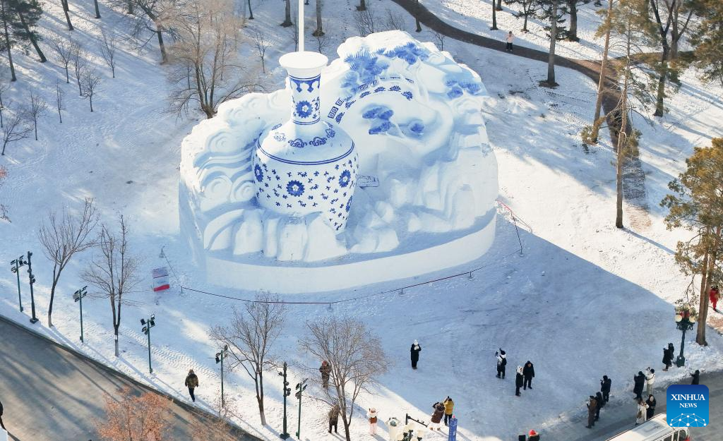 In this aerial drone photo, tourists visit the 37th Sun Island International Snow Sculpture Expo in Harbin, northeast China's Heilongjiang Province, Dec. 23, 2024. The 37th Sun Island International Snow Sculpture Expo began its trial operation here Monday. (Xinhua/Zhang Tao)
