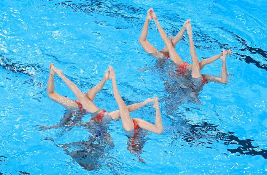 Team China compete during the team acrobatic routine of artistic swimming at the Paris 2024 Olympic Games in Saint-Denis, France, Aug. 7, 2024. (Xinhua/Xia Yifang)