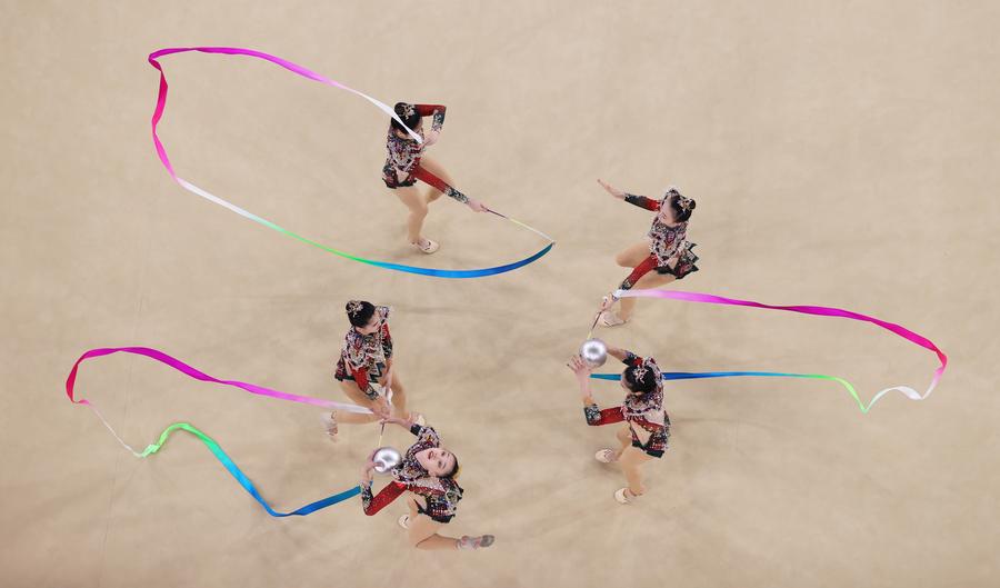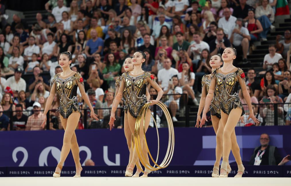 Athletes of Team China compete during the group all-round final of rhythmic gymnastics at the Paris 2024 Olympic Games in Paris, France, Aug. 10, 2024. (Xinhua/Guo Yu)