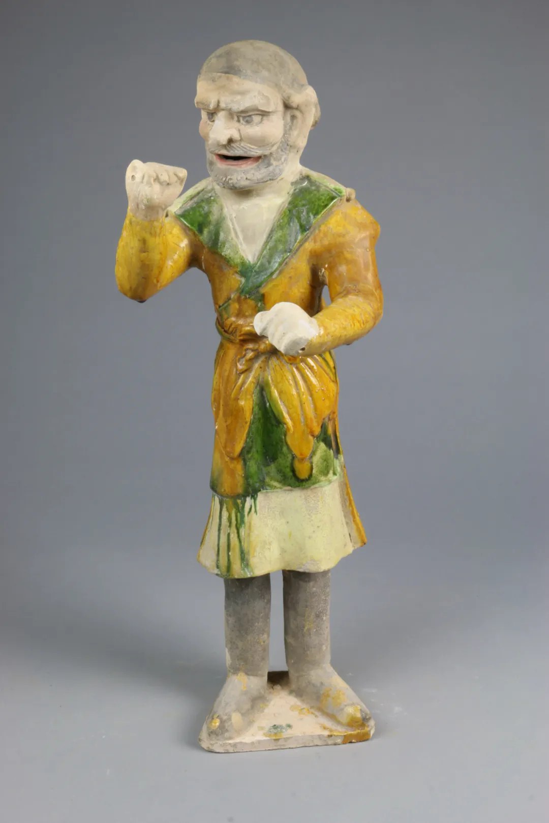 A tri-colored glazed pottery sculpture from the Tang Dynasty (618-907), which depicts a man who leads camels, is called the "fashion icon" of ancient cultural relics due to his colorful clothes.