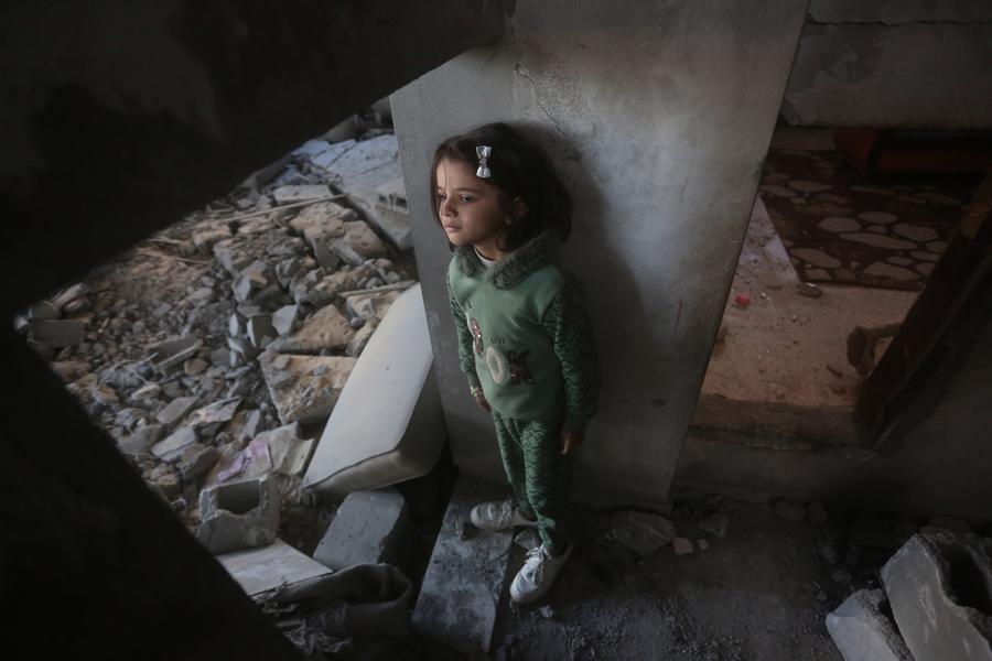A Palestinian child is seen on the rubble in the southern Gaza Strip city of Rafah, Jan. 27, 2024. (Photo by Rizek Abdeljawad/Xinhua)
