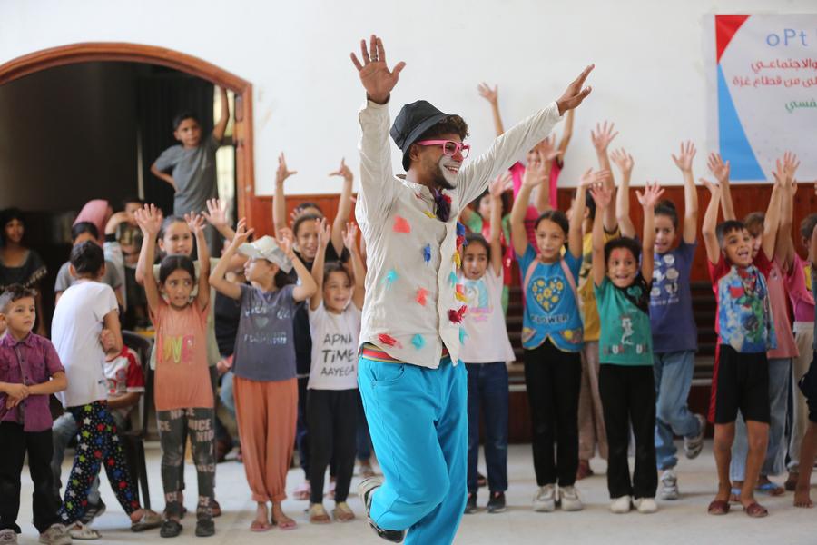 A clown performs for children in the Al-Maghazi refugee camp, central Gaza Strip, Sept. 5, 2024. (Photo by Marwan Dawood/Xinhua)