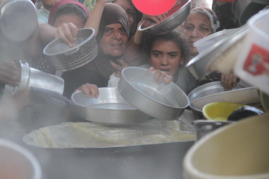 People try to get food relief in Jabalia refugee camp, northern Gaza Strip, Aug. 29, 2024. (Photo by Mahmoud Zaki/Xinhua)